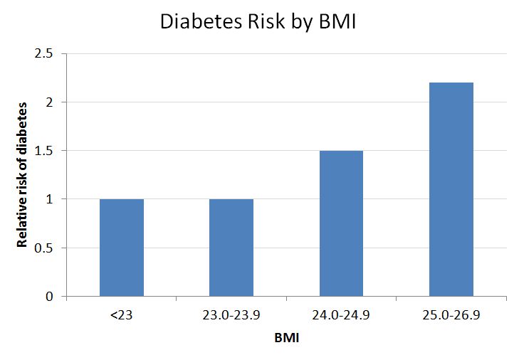 Having a BMI of 24-24.9, which isn't even considered overweight, was associated with a 50 percent higher risk of diabetes, and going just over the cusp of overweight yielded a 120 percent increase in risk. Therefore at nearly all levels of BMI, higher BMI strongly predicted the risk of developing diabetes. This has been repeatedly confirmed.