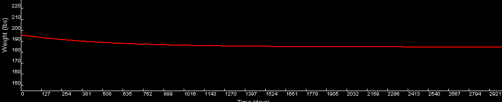 National Institutes of Health researcher Kevin Hall and his team have created a mathematical model that accurately predicts weight and fat changes in response to changes in calorie intake (1). This model has been validated against the results of weight loss trials (2). Based on this model, his team put together the Body Weight Simulator app that allows us to calculate and graph weight changes over time.