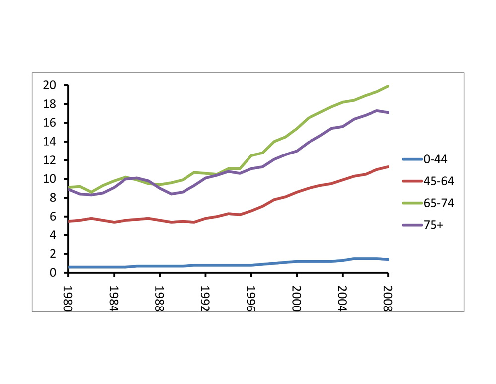 Diabetes affects 8.3 percent of Americans of all ages, and 11.3 percent of adults aged 20 and older, according to the National Diabetes Fact Sheet for 2011. About 27 percent of those with diabetes—7 million Americans—do not know they have the disease. Prediabetes affects 35 percent of adults aged 20 and older.Wow-- this is a massive problem. The prevalence of diabetes has been increasing over time, due to more people developing the disorder, improvements in diabetes care leading to longer survival time, and changes in the way diabetes is diagnosed. Here's a graph I put together based on CDC data, showing the trend of diabetes prevalence (percent) from 1980 to 2008 in different age categories (2):